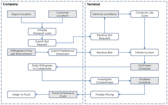 At an appropriate time before the considered time horizon, e.g., a day in advance, the terminal receives slot requests for all potential jobs and associated bids for that day per company. Initially, the terminal operator must finalize the job time costs by accounting for terminal-related operations based on local conditions, such as loading and mounting, which may result in some jobs being dismissed from consideration within the TAS, based on stated job limits. After that, the MTO can initiate the auction and provide an optimized schedule, which is then sent back to the companies. After receiving the schedule, each company needs to indicate their level of willingness to collaborate by specifying the percentage by which they are willing to accept a suboptimal solution as the final schedule, provided it contains characteristics that are desirable for both the MTOs and LMCs. This willingness to collaborate is essential as it provides a way for both parties to show flexibility and enables the synchronization of truck transport under multiple layers of planning. In this study, the increased time interval between any two different jobs is considered a characteristic that the MTOs aim to incorporate into the schedule, while the increased occurrence of double moves in the schedule is desirable for the LMCs. Once the terminal receives collaboration-related input, it can use a precommunicated strategy, such as taking the average or geometric mean across companies’ percentages to investigate compromises and finalize the schedule for that day. Then, the final pricing for each slot assigned to a company is determined, taking into consideration the effect of collaboration in the pricing, and communicated to the company. while each company can assign a truck to a job, or multiple jobs in case of a double move.