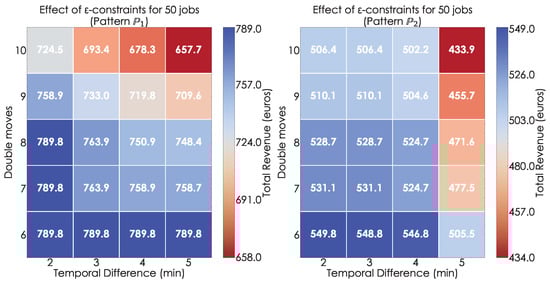 To determine the generation of candidate -constraint solutions, which can be computationally expensive, the limits for double moves () and temporal difference () are initially established in the tables. A maximum of 10 double moves is determined by solving the original instances with a modified objective function that prioritizes double move maximization. For the temporal difference, an arbitrary 5 min limit is considered to be reasonable. This approach allowed for quick identification of solutions that can be used as a starting point for all other instances. Next, alternative assignments with set -constraints are computed, beginning from the highest possible double move and temporal difference of 5 min and decreasing iteratively, until pinpointing a solution that matches the optimal solution in the base scenario.