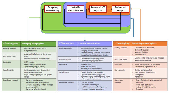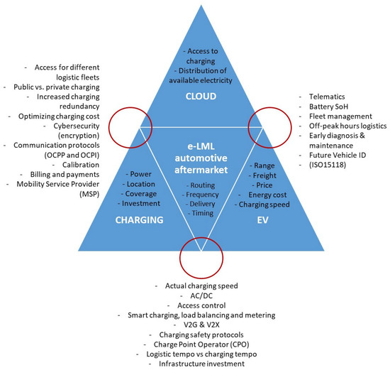 When analyzing the private space of Figure 1 in more detail, it becomes clear that the electrification of the LML is a complex, multivariable endeavor that goes well beyond substituting Internal Combustion Engine Vehicles (ICEV) with their electric counterparts (see Figure 2). It incorporates electric charging groundwork, digital (cloud-based) infrastructure, new business model options, and operational paradigm shifts. Ensuring the transition while preserving (or improving) the quality expectations of the receivers in a robust, reliably profitable approach requires choices and trade-offs that are entirely new compared to previous logistic operations. A successful transition necessitates integrating the different physical (hardware and location), digital, and business elements. It also provides an opportunity to review the current operations with the different logistic network actors to achieve a long-lasting, leaner structure designed for growth [22,23].