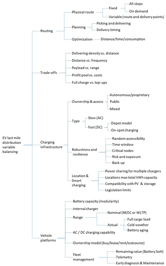 On the first-hand approach, Figure 3 describes some of the criteria and tradeoffs in the design of the newly electrified LML. While some elements, like the routing/scheduling, are expected for any LML (either electric or conventional); other criteria are directly derived from the initial differences in Table 1. They include aspects related to the EV platforms and the necessary tradeoff required for the different types of delivering routes and an adequate vehicle to serve customers on each of them. In addition to those elements, there are fleet-operating considerations regarding providing a supporting structure to the vehicles in their working environment to ensure that they will continue to fulfill the Service Level Agreement (SLA) that customers expect. The concepts of smart charging, load balancing, peak-shaving, and curtailment [36] are now embedded onboard some chargers and have a significant impact on the location and size of the charging facilities and, therefore, on the ability of the electric logistic fleet to accomplish its mission. These features respond to two main classes of boundary conditions to properly balance the grid and the recharging operations: implicit and explicit. Implicit limiting boundary conditions could include grid spare capacity optimization, time-based charging curtailment, and frequency balancing. Explicit boundaries are related to service demand and include constraints and congestion management. The type of last-mile logistics, either with fixed or variable routing, imposes boundaries on the location of charging locations, the number of chargers, and the recharging scheduling. The need for reverse logistics or variable collecting/delivering points equally influences the ability to craft routes compatible with EV autonomy while ensuring optimal vehicle utilization. In some Business-to-Business (B2B) supply chain logistics, the frequency of the deliveries or the time between placing an order and getting it delivered could impose severe boundary conditions on the EV deployment in a given LML route. The distance/time/energy-consumption balancing is more complex and broader on the operational consequences in EVs compared to their diesel equivalents.
