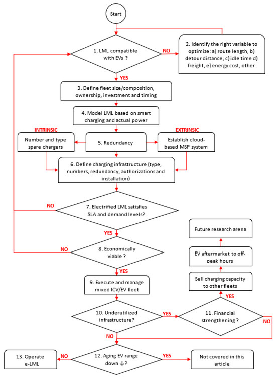 Although not considered in this electrification case, the EV platforms for trucks and prime movers show a lower Technology Readiness Level (TRL) but are moving closer to commercialization. Trucks aim for lower frequencies but longer routes that allow them to recharge overnight using AC chargers of 22 kW (5 to 8 h charging). Heavy prime movers focus on DC charging (even if they can charge with AC-compatible plugs). The focus on DC charging is related to the large capacity of the installed batteries. Fascinating ecosystems are developing either to create ventures of established OEM and electric truck startups [49,50] or to provide those future heavy e-Lorries with innovative, sometimes mobile, charging units using former batteries from EVs [51,52]. The authors maintain the core focus on the actionable electrification of the LML, and the paper will continue with the core emphasis on the first two electrification domains shown in Figure 5.