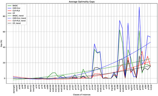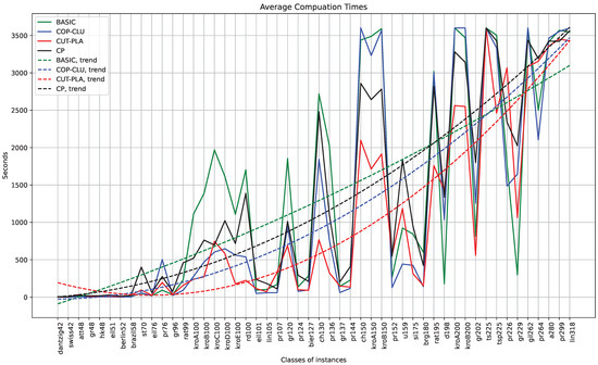 Figure 4 highlights that the approach CP we propose appears to have a similar trend to BASIC and COP-CLU in terms of average computation times, although with different spikes, sometimes worse, sometimes better, with a trend line worse than that of BASIC but better than that of COP-CLU. Although it is not possible to draw accurate conclusions about the method CUT-PLA due to the unknown time spent by the method in preprocessing, it appears to be the fastest of all, but with a degradation in performance associated with the larger instances that poses doubts on scalability, as highlighted by the least promising trend line of all.