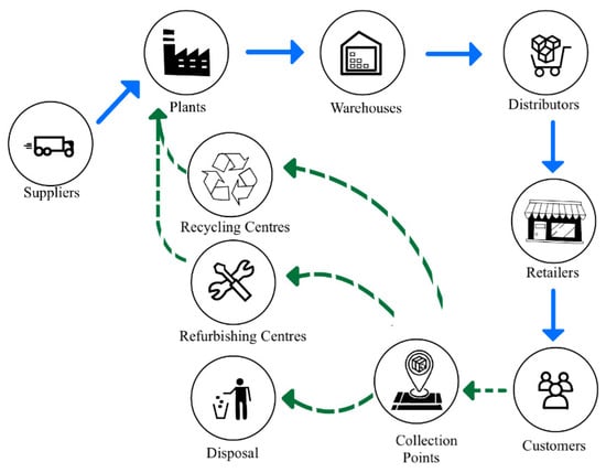 CLSCs enable the recovery and/or reuse of valuable resources, reduce waste generation and lessen the environmental impacts of conventional supply chains. CLSCs include activities such as the design of recyclable products, the collection and classification of used products, remanufacturing processes and the development of RL networks [4,5]. CLSC implementation provides numerous benefits. First, it contributes to environmental sustainability by reducing the consumption of fundamental materials, energy and greenhouse gas emissions [6]. Second, it has positive impacts by recuperating and reusing materials and optimizing logistics and inventory management. In addition, CLSCs promote social responsibility by considering the social and ethical implications of supply chain operations, such as equitable labor practices and community engagement [7,8]. This research is motivated by the above points.