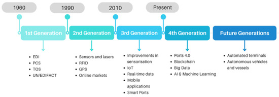 In port history, four significant generations of digital evolution have emerged, each characterized by distinct processes that propel digitalization forward [9]. Figure 2 shows the milestones of the digital evolution of ports, from the beginning of this process to the present, and what is expected in the near future.