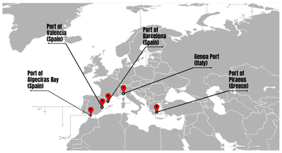 The ports that have been chosen are: Valencia, Barcelona and Algeciras (Spain), Piraeus (Greece), and Genoa (Italy). Some ports of the Mediterranean Sea have been left out of this analysis due to the lack of information, and that is why these ones have been selected, since they will facilitate a coherent analysis with useful results. Figure 4 shows the situation of the selected ports in the Mediterranean.