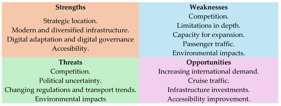 As already mentioned, to understand the present, a SWOT analysis of the port industry of the Mediterranean Sea has been carried out, studying its Strengths and Weaknesses, its internal characteristics, its Threats and Opportunities, and external characteristics (Figure 5).