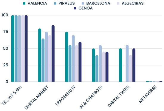 The evaluation has considered aspects such as transparency in management, the accessibility of information, data security, port operation and efficiency in the management of digital resources. Therefore, it has been determined that the port that currently has the best digital governance is Valencia, followed by Piraeus, Barcelona and Algeciras with a very comparable management and, finally, that of Genoa (Figure 11).