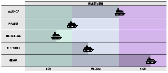 Next, the information pertaining to investment in ports, as indicated by governance investment and infrastructure indicators, has been collected, revealing disparities between them (Figure 8). Nevertheless, it is evident that over the years, all the case studies have been striving to adapt to the expanding international trade and global logistics chains to maintain their competitiveness in the Mediterranean region. It is intuited that this practice will continue with the same growing trend due to the need to improve ports either physically or digitally, for which access to economic resources is necessary.