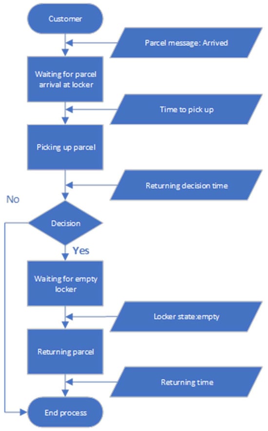 Customers (Figure 1) are stochastically created in the system. Once they appear, they place orders. The customer enters a state of waiting until they receive a message about the parcel arriving at the locker station. Following the time to pick up the order, the customer takes the parcel (the locker becomes empty) and then waits for the decision time to return the order or not. If the decision is not to return the order, both the customer and the parcel are disposed. If the customer makes the decision to return the order, they wait until they receive a message confirming the availability of an empty locker for returning. The time for returning the parcel and placing it in the locker is counted; then, the customer is disposed.