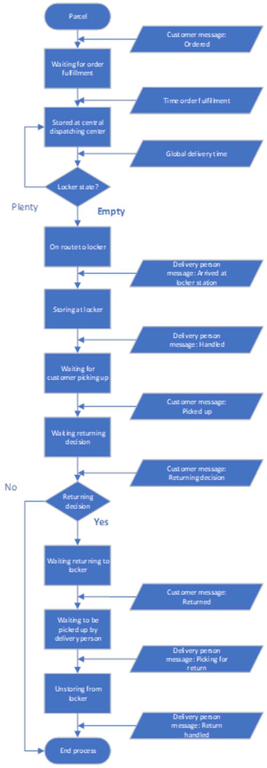 When an order is placed, a parcel is created (Figure 2). Parcels arrive at the dispatching center after a required time to fulfill the order by the retailer. The parcel is stored at the central dispatching center and waits for the next delivery time. If there is an available empty locker, the parcel is delivered, or else it stays at the dispatching center, waiting for an available locker in another delivery cycle. A locker with a returned parcel inside can be used by a new parcel. The parcels to be delivered are taken on route to the lockers’ station. Once having arrived, each parcel is handled by the delivery person and stored into the locker. The locker becomes full, and a message is sent to the customer to be informed about the delivery. The parcel waits to be picked up by the customer and then waits for the decision of returning or not. If the order is accepted, the parcel is disposed; otherwise, the parcel is returned to the locker and a message about returning is emitted by the customer. Between the decision moment of returning and the moment when the returned parcel is put into the locker, the locker is in the state “reserved” and cannot be used for another delivery due to the potential conflict (two parcels in the same locker). The returned parcels wait for the delivery person to take them back to the dispatching center. The returned parcels are handled (unstored from lockers) before the parcels to be delivered.