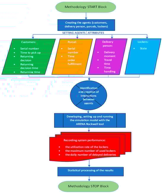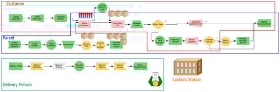 Integrating agent-based models with Monte Carlo simulation is quite effective for different fields of study [53,54,55,56,57,58,59]. The agent-based model for parcel locker deliveries was implemented in an ARENA 12 simulation program (Figure 5). The simulation program follows the state charts of the agent-based model described in Section 3.1.