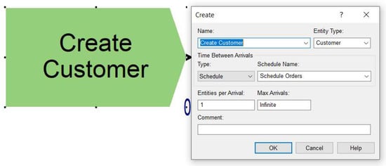 | Customer | Create Customer | Create | Each customer is stochastically created. The creation can be based on a schedule or on a time distribution between customers (Figure 6). |