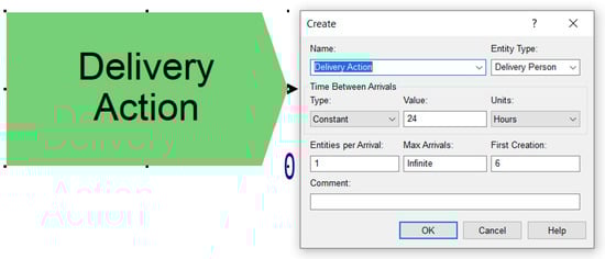 | Delivery Person | Delivery Action | Create | Creates the delivery person as an entity (agent) in the system. The delivery person starts their activity daily at a moment specified by its characteristic “delivery time” (Figure 10). |