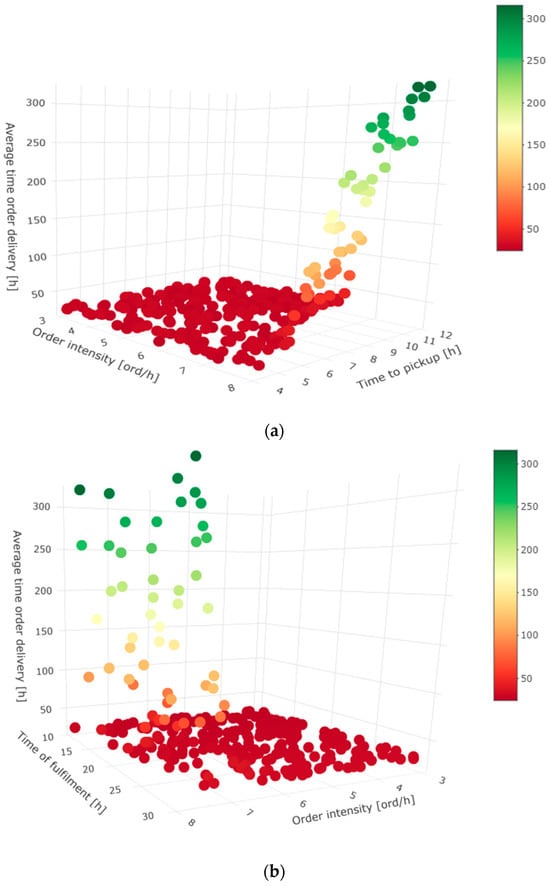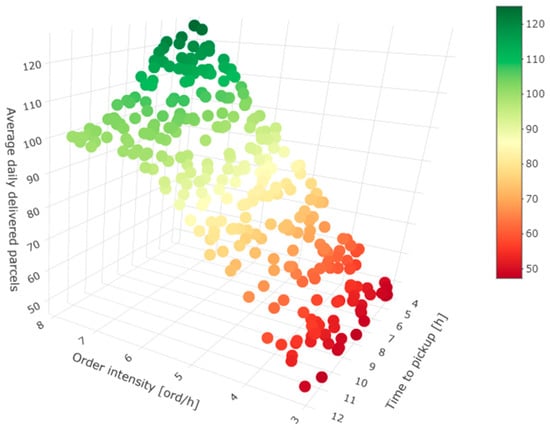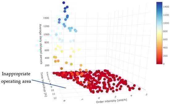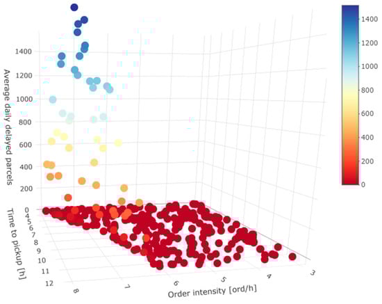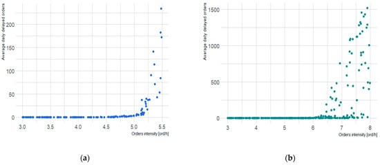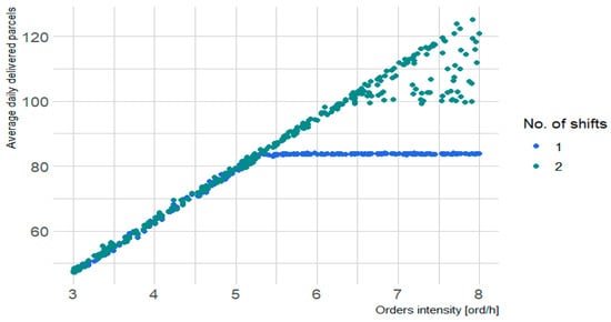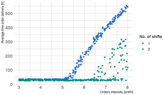 Comparing the two scenarios, one can conclude that for orders’ intensity less than 5.1 [ord/h], the locker station can work with one daily delivery shift, allowing good MOPs and providing satisfaction for customers. With an order intensity between 5.1 and 5.4 [ord/h], the system is still operational, but the non-stationarity in delayed orders’ time series generates long delivery times and storing problems. The company should balance between keeping one shift and switching to two shifts. For more than 5.5 [ord/h], two daily delivery shifts are mandatory; thus, the system can improve the MOPs. With two shifts, the time to pick up the parcel becomes a significant predictor, and in combination with the orders’ intensity can delineate areas where the system works properly or becomes overloaded again (Table 7).