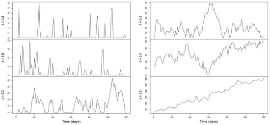 Up to an order intensity of 5.1 [ord/h], the delayed orders’ time series is stationary (green cells). Between 5.2 and 5.4 [ord/h], the system experiences a non-stationary delayed orders’ time series without a noticeable drift or trend (yellow cells), while at 5.5 [ord/h], a trend is reported (red cell).