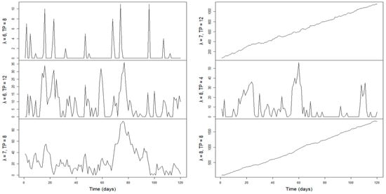 The green cells reflect operating conditions where the delayed orders’ time series is stationary, there are small fluctuations in the number of delayed orders, and consequently the time to deliver the orders is kept at reasonable limits. The yellow cells correspond to operating conditions for which the delayed orders’ time series becomes non-stationary, but no trend and no drift are recorded. There are higher variations in the delayed orders’ inventory and some customers can experience long delivery periods. The locker station can still operate, but with lower performance. The red cells depict areas where the system becomes overloaded. The delayed orders’ time series is non-stationary, and a time trend is recorded (the number of delayed orders increases indefinitely). Increasing the lockers’ point capacity (the number of lockers) is the sole solution for further operation with these parameters.