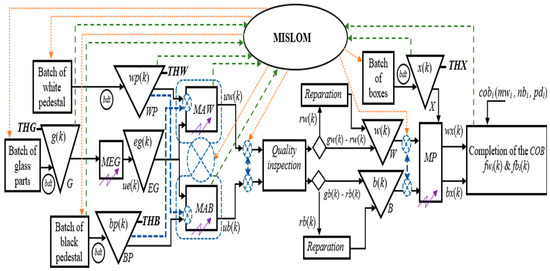 The role of the MISLOM is to order automatically a batch of parts from the supplier when a buffer level falls below a fixed order threshold (see Equations (5)–(8)). Furthermore, the MISLOM has a more important role in that it regulates the production flow according to machines states and the achievement of the COB, indeed, for example, when the number of flinched products with a white pedestal reaches the ordered number (i.e., fwi(k) = mwi), but the number of flinched products with black pedestal is less than the ordered number (i.e., fbi(k) < nbi). In this case, and when the machine MAW is up, the MISLOM orders the MAW to assemble the glass parts with black pedestals using the buffer WP. In addition, it orders MP to package the flinched products with a black pedestal in place of the ones with a white pedestal. Thus, the flow of the products with a black pedestal increases and reaches quickly nbi and then may the COB will be achieved before the planned deadline. This is vice versa when fwi(k) < mwi and fbi(k) = nbi (see decision flows in Figure 1). The MISLOM operating is illustrated by the following equations.