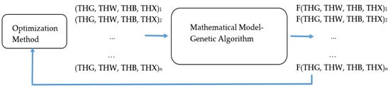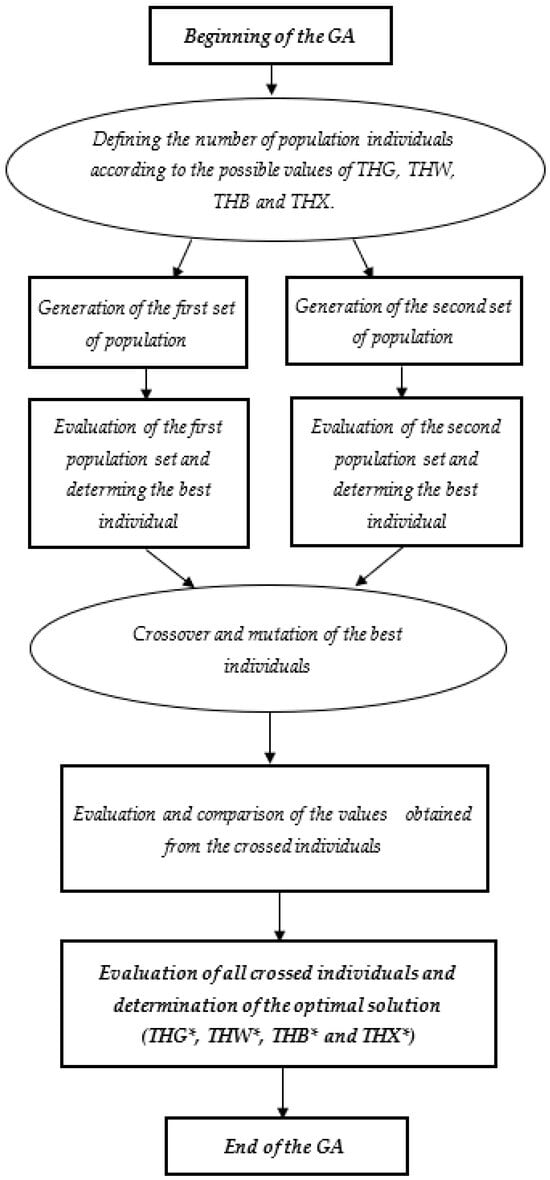 The proposed GA is based on one algorithm that performs an optimization problem with four discrete variables (THG, THW, THB, and THX). Each variable varies in the interval [1, 100]. In the first step, the optimization algorithm tests 500 sets of values (population) that are determined randomly. In the second step, the optimization algorithm explores the best solution obtained from the test and then repeats several iterations until finding the optimal solution. In each iteration, the optimization algorithm defines a new set of individuals for the decision variables and then uses the simulation program to evaluate the corresponding profit. According to the evaluation, the optimization algorithm performs crossover and mutation in order to determine the new set. When there is no improvement between two successive iterations, the GA optimization algorithm stops the iterations and then the optimal solution is found. To illustrate the process steps of the proposed GA, we have provided the schema below (Figure 7).