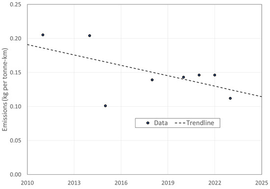 A final emissions reduction approach involves efficiency improvements for conventional long-haul diesel trucks. Efforts have been underway for decades to improve fuel efficiency, well before the advent of ZEVs [71,90]. By the later 2000s, efficiency improvements were identified across the continent as a significant opportunity to reduce fuel consumption [15,91]. While initially focused on conserving fuel and reducing costs, such efforts also reduce GHG emissions. The leading North American organization in this area is NACFE, which documented the benefits of “green trucking” [92]. The U.S. Environmental Protection Agency (EPA) has observed reductions in freight transport GHG emissions for trucking (in kg per tonne-km) since 2011, as shown in Figure 1 [93].