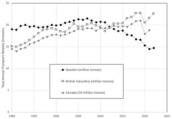 Transport emissions in Sweden, BC, and Canada. Data sources: [102,103,104].