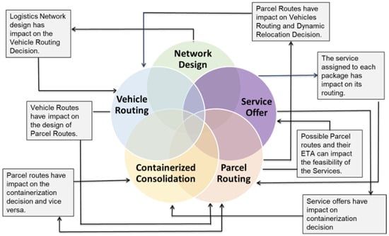 Due to the inherent complexity of HMPL systems and the interconnected nature of various multi-stakeholder strategic, tactical, and operational decisions, providing a holistic assessment of the feasibility and added value of this new concept is challenging and has not been accomplished to date. To illustrate the complexity in assessing the feasibility and value of the proposed HMPL scenario, Figure 1 schematizes sample interactions between several decision domains in shipping a parcel, highlighting the intricate web of decisions and interactions necessary for effective HMPL operations.