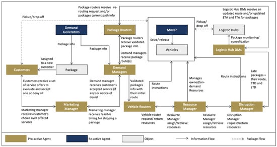 The hubs and vehicles are essential assets to the urban parcel logistics for handling and moving the packages. In order to plan and operate hubs and vehicles, a variety of reactive and proactive components are needed to take over actions and critical decisions, respectively. Reactive components are those who do not need intelligent decision-making capability but act according to the instructions they receive (for example drivers and couriers); while proactive components are tasked with making key decisions using a variety of methodologies and policies. Figure 4 provides an overview of the general framework of our target urban logistic system, different proactive and reactive components, objects, as well as the most important interactions between these components at an aggregate level.
