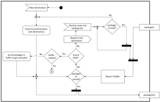 Figure 5 illustrates the driver processes within the hubs. When a driver arrives at a hub/node, it is first scanned to find if there are any packages in his vehicle to unload; if yes, those packages are removed one by one from the vehicle. If there are no packages to unload, or all such packages are removed from the vehicle, the system checks if the driver’s shift is over; if so, it is then checked if the driver’s vehicle is empty, in which case, the driver is released from its task. If the driver’s vehicle is not empty, the system forces the driver to unload all packages on board even if they were not supposed to be unloaded at the current hub. These packages will be picked up by another driver later to continue their path to their next destination.