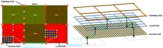 Pivot hubs connecting consecutive logistic elements (a: urban area, b: local cell, and c: unit zone).