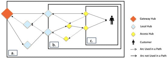 - Consecutive segments along a package’s logistic path are linked by hubs. These hubs are called pivot hubs as they connect two different logistic elements, enabling the package to move from one tier to its lower or upper tier in the logistic web. Figure 8 shows an example of a logistic path () for an intercity inbound package and illustrates the pivot hubs connecting different tiers. A package enters the first logistic element along its path through its pickup point and exits the last logistic element at its delivery point. The remaining transitions between consecutive logistic elements happen through the pivot hubs.