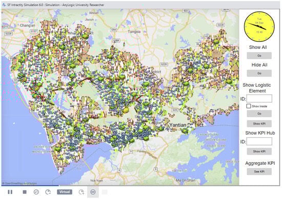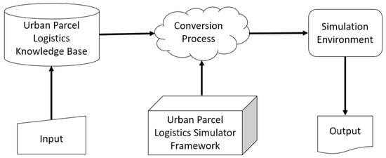 Furthermore, the traditional optimization models fail to capture the scope and scale of the package delivery networks as a system, given their agent-based nature and the complex interaction between different decision-makers. Considering the large scale, high complexity, and fast dynamics of logistics operations in megacities, simulation tools play a more effective role in building such integrated platforms for assessing performance and enhancing operations in parcel delivery systems. Simulation also allows for evaluating a wide set of interrelated key performance indicators []. Several settings are introduced in [] in which simulation modeling provides more benefits as compared to the optimization: in particular, (and as pertinent to the context of our study), where “the new concept does not exist and experimentation with a real-world model is too expensive or time-consuming”, and “when the problem is too complex that the outcomes are not simple and one sided”.