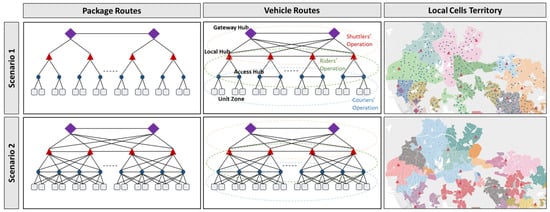 Stepping beyond the traditional hub-and-spoke configuration, there are a variety of studies in the literature that assess the optimal design of a logistic network to better save in terms of transportation time and costs [,]. Crainic et al. were among the first to assess the shift from a single-tier to a two-tier delivery system []. They also modeled the demand uncertainty [] and studied synchronized multi-trip multi-traffic pickup and delivery [] under a 2-tier structure. When it comes to large and mega-cities, the use of multi-tier (more than two-tier) logistic networks can be justified []. Several studies have expanded the two-tier network to multi-tier [,,] or have included other variations such as collection-and-delivery points []. In 2018, Montreuil et al. presented the first formal representation of the Multi-tier Urban Parcel Logistic Web which promises the capability for efficient and sustainable offering of faster delivery services across megacities [] and has received attention from many scholars in the last years [,,].