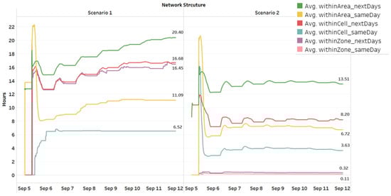 For each scenario, Table 2 presents findings regarding the space needed to transport a volume of parcels per kilometer, along with the ratio of total container space to the total parcel volume shipped throughout the network. The outcomes indicate that the FD policy exhibits the most substantial space requirement, primarily because it involves the use of smaller containers that are, on the whole, less efficiently utilized. Conversely, the ND policy, which employs larger and more efficiently utilized containers, demonstrates the least surplus capacity. That said, this result does not necessarily imply that one should impose more transportation costs to save on handling costs.