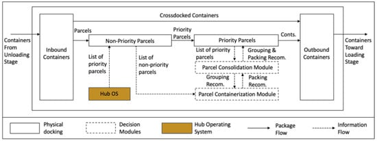 Upon arrival of the packages at the hub (after being unloaded from a truck or dropped by a customer) the package is added to the hub buffer. The buffer is a general term representing a temporary storage space at the unloading docks or loading docks, a dedicated temporary storage space inside the hub, or a temporary space provided for package containerization/de-containerization. Next, if parcels within an inbound container are all heading toward the same subsequent destination, the container is moved to a buffer (which might be at the loading/unloading stage) to wait for a proper outbound truck; On the other hand, if the parcels within the inbound container are heading toward different subsequent destinations, the container is moved to a buffer (this could include shipment from inbound docks buffer stage to the temporary storage), and is opened at a proper time (de-containerized). The individual parcels may dwell for some time at the hub buffer until enough load toward their subsequent destination is aggregated or their target departure time is reached (whichever happens first) to be consolidated and containerized. The new containers will be then waiting in a buffer (which could be the hub’s outbound docks) to be loaded onto a proper truck.