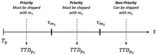 To achieve a specific service level, each parcel p is only offered services with delivery times exceeding , the fastest estimated arrival time for parcel p on its origin-destination route. Let represent the promised delivery time for parcel p at its destination. The slack time is then calculated as . We define as the target departure time from vertex i for parcel p to ensure timely arrival at its final destination. To utilize the slack time in determining parcels’ at each vertex along their route, we proportionally distribute this extra time among different segments of the parcel’s path using the following formulation: