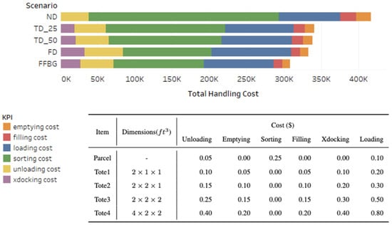 Furthermore, the cost savings in unloading, loading, and crossdocking associated with the adoption of larger containers in the FFBG policy outweigh the additional sorting expenses when compared to the FD policy. As a result, the FFBG scenario emerges as the most cost-effective option overall, as depicted in Figure 19.