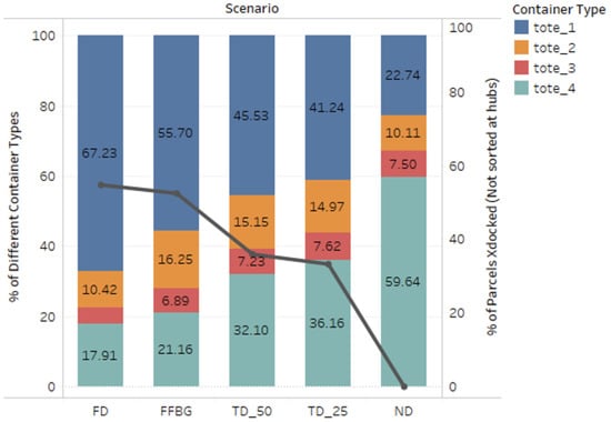Percentage of Different Container Types Used in Different Scenarios (The gray line indicates the percentage of parcels that are crossdocked at hubs in each scenario—results include initial sorting hubs).