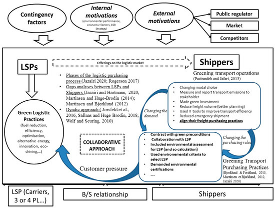 In this regard, Jazairy et al. (2021, p. 424) [11] (p. 424) note that “LSPs” implementation of green logistics practices (GLPs) (e.g., green modal shifts, alternative fuels, and green warehousing) is, to a large extent, dependent on the relationships formed with and the actions made by shippers (i.e., logistics buyers’). In other words, shippers’ ability and motivation to change the way they buy transportation services and LSPs’ environmental commitment can concretely contribute towards green transportation. Therefore, the interaction between these two actors provides a relevant level of analysis of the GLPs (Bask et al., 2018; Jazairy, 2020; Martinsen and Björklund, 2012; Nilsson et al., 2017; Rahman et al., 2022; Wolf and Seuring, 2010) [12,13,14,15,16,17].