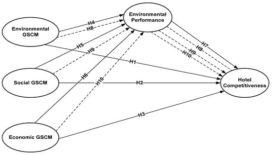 Numerous studies, e.g., [,,,,,], underlined the key function of EP in the relationship between GSCM and an enterprise’s competitiveness. GSCM integrates a wide range of techniques—environmental, social, and economic—that encourage ecologically friendly operations along the entire supply chain []. Surprisingly, EP emerges as an essential indicator of successful GSCM implementation and a fundamental predictor of an enterprise’s competitiveness [,]. Strong EP demonstrates a commitment to sustainability, respect for environmental standards, and operational efficiency—aspects that strongly influence guests’ perceptions and stakeholder decisions [,]. In the fiercely competitive hospitality business, hotels that display robust EP as a result of successful GSCM practices are distinguished as leaders [,]. These hotels attract environmentally concerned guests and secure their overall market position [,,,,]. Building on this basis of knowledge, the current study proposes the following hypotheses: