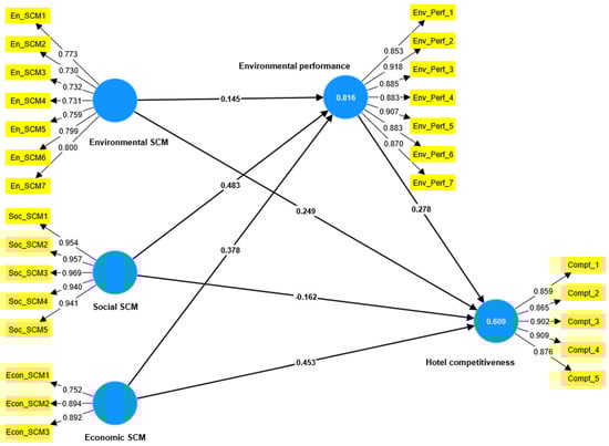 The three dimensions of GSCM (environmental, social and economic) have a significant influence on environmental performance of hotels. This means that when hotels adopt these dimensions of GSCM, hotels are more likely to reduce greenhouse gases, wastewater, waste overall, and pollution. They also significantly contribute to decreasing cost of material purchasing, cost of disposal of hazardous materials, and cost of waste treatment. The results support previous studies, which also confirmed that environmental dimension of GSCM contributes to the reduction of greenhouse gases, footprint and encourages environmentally responsible behavior and performance [,]. In addition, social GSCM, which considers sustainability efforts of employees, customers, community, suppliers, and government, has a strong relationship with environmental performance [,]. Moreover, economic GSCM, which focuses on resource efficiency, cost-effective practices, and market share growth, enhances environmental performance [,]. The results also confirmed that environmental performance significantly affect the hotel competitiveness. This implies that when hotels maintain environmental performance, they gain a competitive advantage compared to other hotels that pay less attention to environmental performance. In other words, environmental performance enhances hotel image, supports customer satisfaction, improves service quality, increases productivity, and ensures higher profit. This finding is supported by previous studies [,].