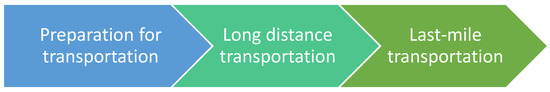 For the transportation of goods, we can identify three segments: preparation for the transport, long-distance transport and last-mile transport, as depicted in Figure 1. The preparation phase in e-commerce logistics focuses on efficiency and sustainability. This involves selecting environmentally friendly packaging materials and optimizing package sizes to reduce waste and transportation space. Advanced software is used for inventory management and order processing, ensuring that goods are prepared accurately and swiftly for dispatch.