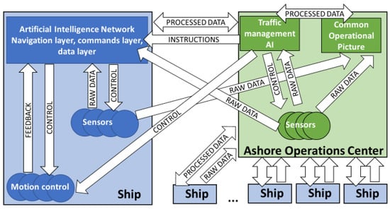 This section explores how can autonomous traffic management systems be implemented near ports, emphasizing the role of the Ashore Operations Center (AOC). The AOC is a pivotal innovation for managing vessel routes near shorelines. Its role is to provide advanced planning of routes and ensure their safe implementation through either direct control or validation of routes proposed by Autonomous Surface Vessels (ASVs). This concept is particularly envisioned for large ports where traffic density is high, and the coordination of diverse vessel types (autonomous and manned) is essential. The implementation of networked AOCs allows for efficient sector-based management and seamless hand-over–take-over of vessels as they traverse different port sectors. Figure 2 depicts the components of a vessel traffic system and the data links between the components (one channel for raw data from sensors and one channel for processed data, instructions, commands and feedback).