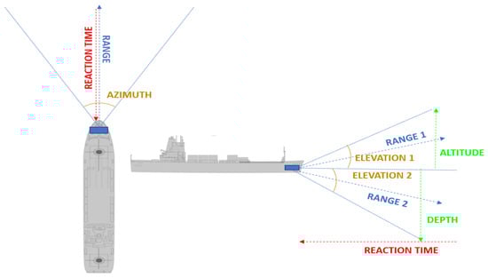 The sensors in a vessel traffic system can be divided into two main categories [24]: onboard sensors managed by the ship and ashore sensors controlled by the AOC. Onboard sensors are divided into two categories: essential sensors, like GPS, for fundamental operations, and specialized sensors for specific tasks such as docking. These sensors must be reliable, energy-efficient, and cost-effective, encompassing technologies like GNSS, AIS, Sonar, EO, IR, SAR and LiDAR. These sensors are critical for creating a comprehensive environmental overview to avoid collisions. Task-specific sensors, focusing on precision and timeliness, aid in detecting and navigating around nearby objects, especially in congested areas. The critical requirements for the sensors, particularly for the bow sensors must ensure an appropriate range to effectively detect both above-water and submerged obstacles (see Figure 3). Key considerations include the sensor’s range, depth detection, azimuth angle, and elevation capabilities. These parameters are vital for providing sufficient reaction time, allowing the vessel’s AI system to analyze and react to potential hazards. This ensures safe navigation by preemptively identifying and responding to various obstacles, both seen and unseen, in the vessel’s path.