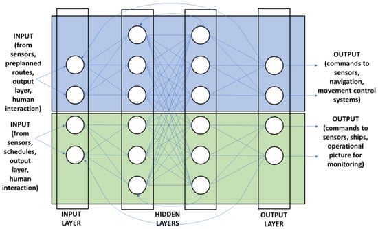 The proposed architecture of Artificial Intelligence (AI) neural networks for maritime logistics is based on a “many to many” recurrent neural network model. This model integrates various elements like ship AI (handling navigation and sensor control) and the AOC AI (responsible for traffic management and generating a common operational picture). The network’s design emphasizes feedback loops between all neurons, enhancing the system’s ability to make real-time decisions based on sensor inputs. The use of Field-Programmable Gate Array (FPGA) boards is preferred, in the view of the authors, for their robustness and low latency, crucial for processing time-sensitive signals from various sensors. The architecture also allows the integration of CPU or GPU hardware solutions, adapting to different operational needs. Figure 4 illustrates the designed recurrent neural network architecture for implementation in the system. This network is conceptualized as a complex interconnected system, essentially a network of networks, each serving specific functions within the broader system architecture. AOC’s architecture should be open, in a federated configuration, allowing approaching ASVs to connect to the federal network.