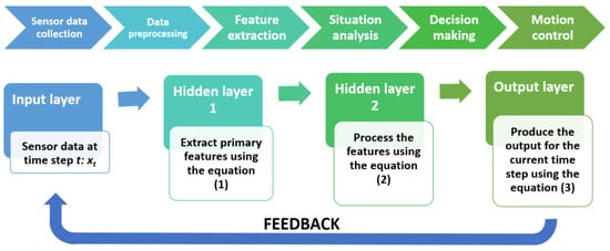 The process from sensor data to motion control commands involves several steps. In Figure 5, a flowchart diagram illustrates this process, followed by an explanation of the process in each layer of the proposed RNN. In the first step, data are gathered from various onboard sensors and from AOC. In the next step, the collected data are normalized to ensure consistency and any missing or incomplete data are handled to maintain data integrity. All the data are fed into the input layer.