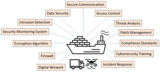 The increase in system autonomy elevates the potential cybersecurity risks that could disrupt logistics operations. Ensuring the security of data and operational control systems is paramount. Strategies must include robust encryption methods, continuous monitoring, and the implementation of advanced security protocols to safeguard against unauthorized access and system breaches. In autonomous systems, but more pronounced in maritime transportation, cybersecurity threats and the corresponding countermeasures are paramount considerations. The threats range from communication system breaches to sensor manipulation, potentially compromising vessel operations. Effective countermeasures include advanced encryption, robust firewalls, and frequent security updates (see Figure 8) [45,46,47,48]. These measures are vital for protecting the integrity of vessel or port control systems and ensuring the safe navigation of autonomous ships in increasingly digital maritime environments.