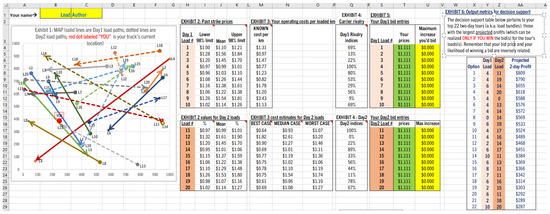 Figure 1 displays the respondent’s truck location (using an Excel formula) and each load’s travel lane. Along with the map for visualizing the network and the carrier’s top 22 two-day bundles (ranked by projected profit if the bundle is won), respondents’ decision support information includes lane strike price history, transportation costs, and inter-carrier rivalry intensity. While the template may appear to present metrics that are inaccessible to practicing carriers, it mirrors carriers’ experience-based knowledge on matters such as bundle priority (akin to the provided top 22 bundles) and past strike prices. We created the historical strike inputs (modeled after North American trucking features) as follows: