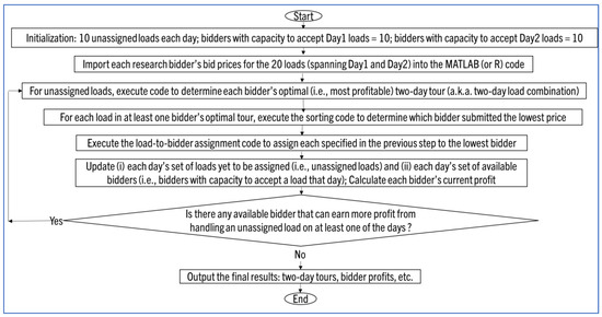 - Shippers solve winner determination problems (WDPs) to select carriers for their loads. This process, applicable to truckload and less-than-truckload settings—e.g., Lyu et al. (2019) [2]—proceeds to subsequent rounds if any carrier with capacity can profit from being selected for any unassigned load. We coded and verified this process in MATLAB (Release 2021b) and R to ensure accurate simulation of auctions. The coding to simulate the auction process produced the findings that will be presented later in the Results section.