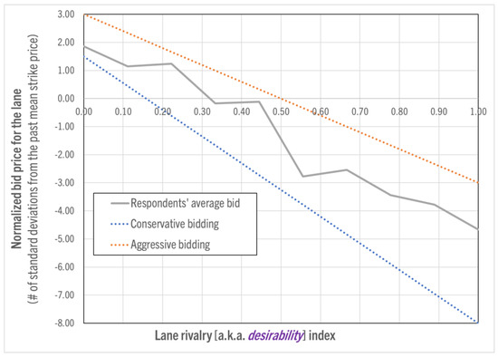 In this subsection, we assess respondents’ pricing rationality. A way we describe bidding behavior is by referencing the extremes covering most of the 5160 observed bid prices. Ranging from conservative to aggressive pricing in (4) and (5), these extremes use the lane’s historical mean (μθ) and standard deviation (σθ) of strike prices, along with the lane’s rivalry index (θ). This range encompasses 99% of the observed bid prices. Complex expressions, including the square, square root, and logarithm of θ, did not significantly improve accuracy, so we retained the more manageable expressions in (4) and (5).