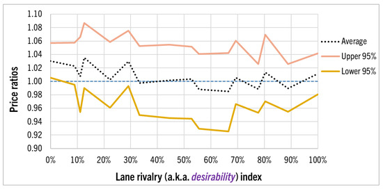 This subsection addresses the second research objective: testing the hypothesis that respondents’ prices align with risk aversion’s prediction of underpricing. For each load-delivery transaction in the experiments, we calculated the ratio of the winning respondent’s price (i.e., the strike price) to the price that would have maximized the respondent’s long-run expected profit (i.e., the optimal strike price for the formulation in (3)). The observed mean ratio of 1.000 was not found to be statistically less than 1 (p-value ≃ 0.48), which means no support for the underpricing hypothesis (H1). Figure 4 illustrates this, displaying means and 95% confidence interval limits for the observed price ratios. The means indicate both overpricing and underpricing. Overpricing (mean ratios > 1) invariably occurred on less desired transportation lanes (equating to the loser’s regret: losers on those lanes missed opportunities to win bids and be profitable at unusually high prices just below the winners’ prices). The converse characterized the most desired lanes. On lanes with intermediate desirability levels, optimal prices are typically equal to the mean strike prices.