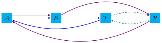 - Path with transshipment.The vehicle operates the service, transports the waste towards a transshipment location, and returns to the starting depot (blue arcs). Subsequently, the waste from the transshipment location is transported to a plant by the end of the day (green dashed arcs).